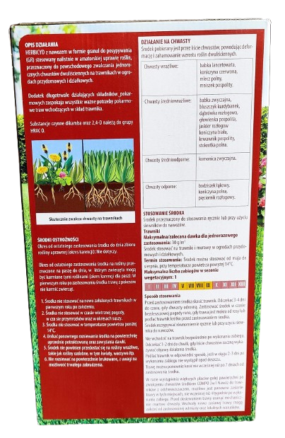 Herbicyd z nawozem w formie granul do posypywania (GR) stosowany nalistnie w amatorskiej uprawie roślin, przeznaczony do powschodowego zwalczania jednorocznych chwastów dwuliściennych na trawnikach w ogrodach przydomowych i działkowych.