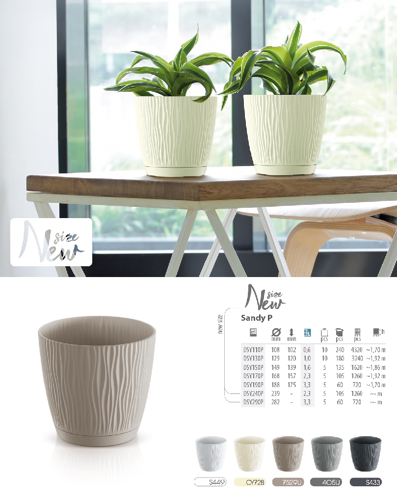 Doniczka z kolekcji SANDY o powierzchni uszlachetnionej łagodnie falującymi pionowymi żłobieniami, uformowanymi na wzór pustynnego piachu.