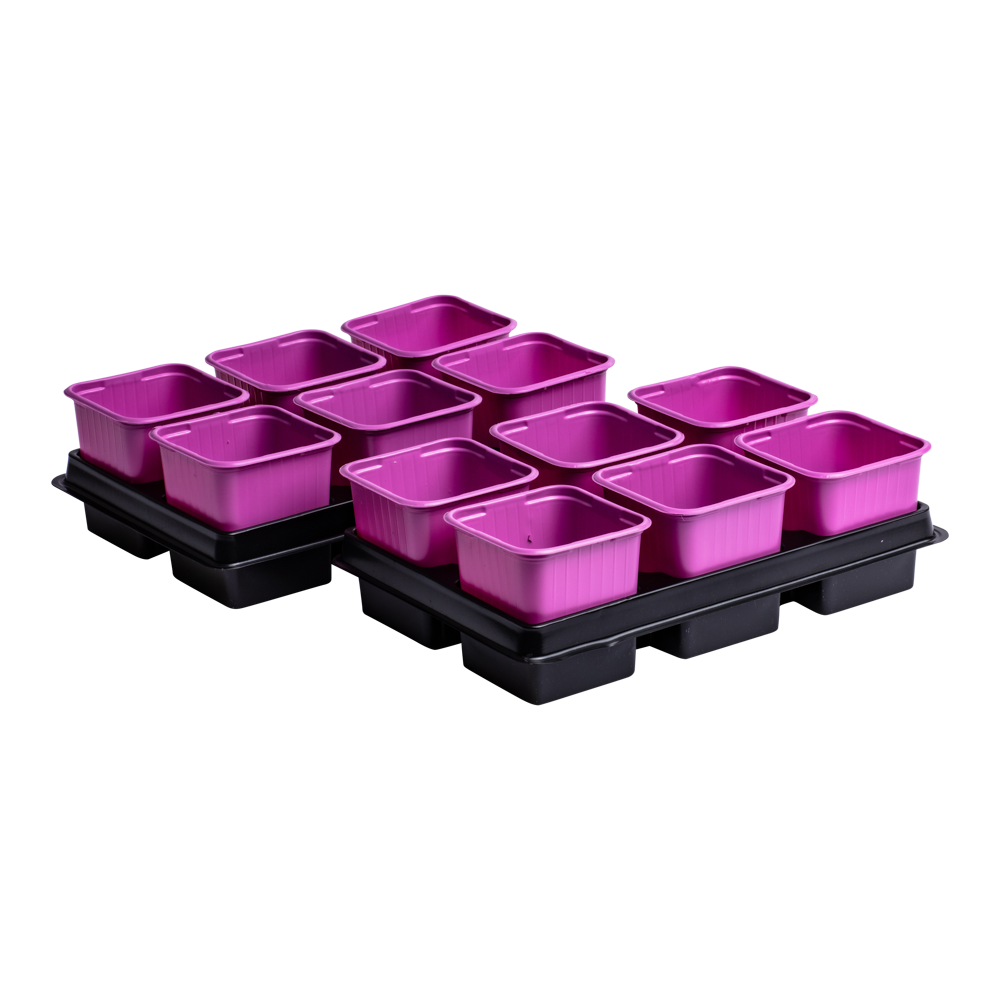 Praktyczny zestaw doniczek z tackami do produkcji rozsad, dostępny w atrakcyjnych kolorach. Wyprodukowany przez firmę VEFI, specjalizującą się w akcesoriach do rozsad, takich jak doniczki, miniszklarenki czy tace.