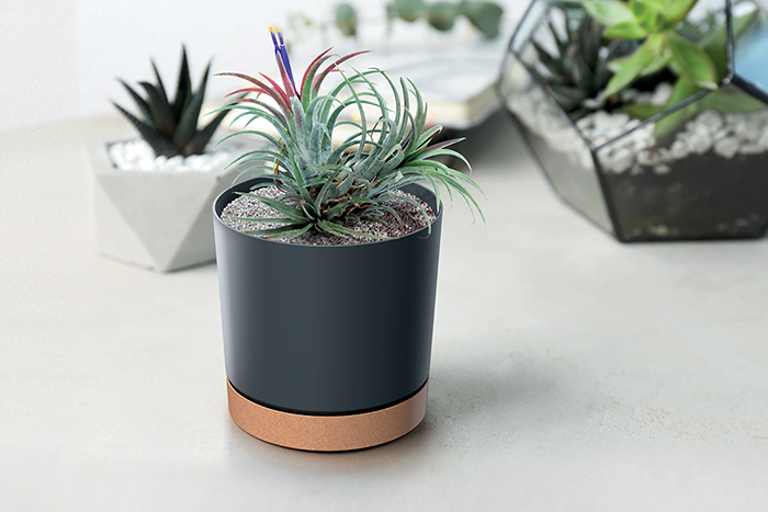 Doniczka jest w zestawie z dołączaną podstawką w kolorze Naturo z kolekcji ECO Wood, która zawiera do 33% naturalnego drewna.