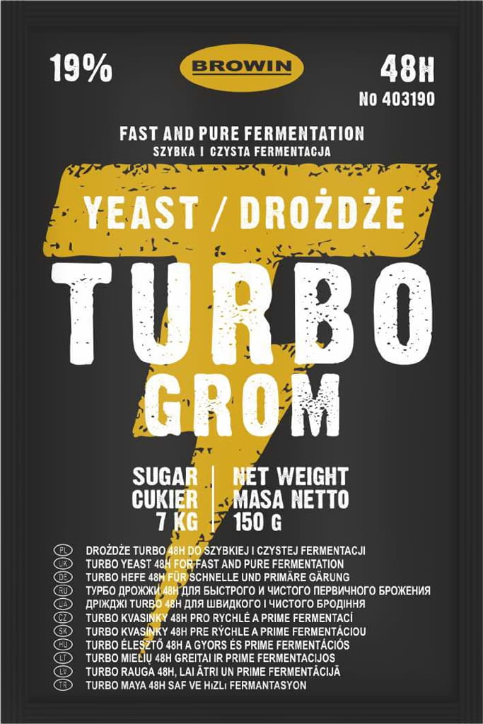 DROŻDŻE TURBO GROM 48h to połączenie aktywnych, wysokoalkoholizujących drożdży gorzelniczych z precyzyjnie opracowaną dla nich pożywką. Gwarancja szybkiej, czystej i wydajnej fermentacji nastawów cukrowych.
