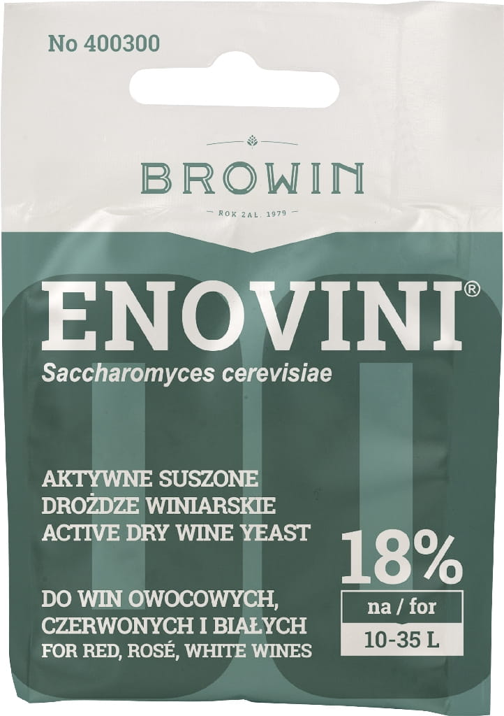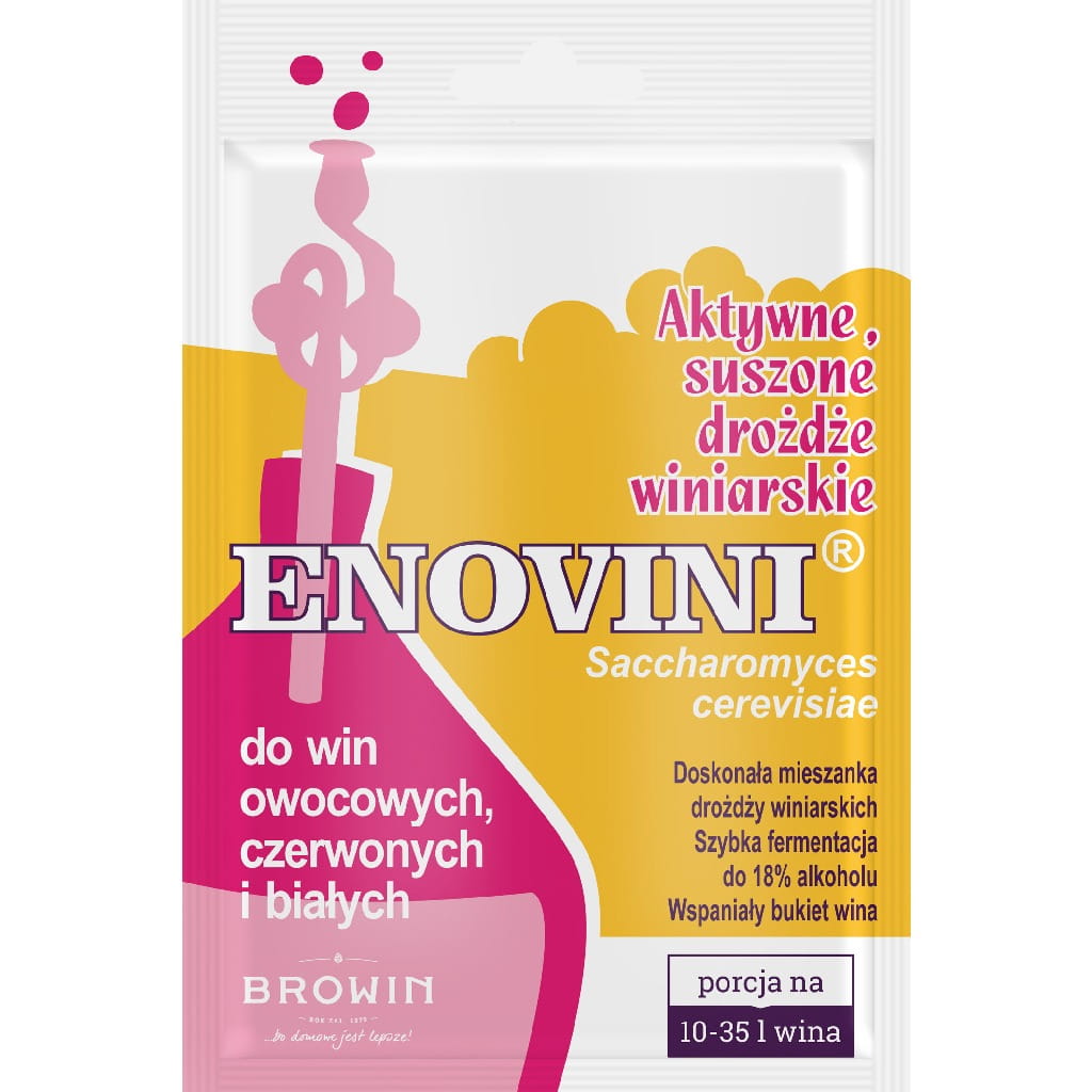 Opis produktu: Uzyskanie wina z moszczu owocowego zawdzięczamy drobnoustrojom – konkretniej dużej grupie drożdży należących do gatunku Saccharomyces cerevisiae i Saccharomyces bayanus . Stosowane w przemyśle winiarskim, specjalnie wyselekcjonowane i udoskonalane w laboratoriach, szlachetne drożdże winiarskie podzielone są na szereg ras w zależności od preferencji substratowych (rodzaju owoców, stężenia cukru), szybkości i wydajności produkcji alkoholu. Charakterystyka produktu: Komórki wysoce aktywnych drożdży, suszone są fluidalnie il.7 g. Pojedyncza dawka wystarcza na przygotowanie do 35 l wina. Enovini® Saccharomyces cerevisiae - doskonała mieszanka dwóch szczepów drożdży winiarskich, do win owocowych, czerwonych, różowych i białych, nadająca niepowtarzalny bukiet. Zachowują owocowy bukiet. Drożdże Enovini® fermentują w temperaturze 15 - 30°C. Tolerancja na alkohol do ok. 18 %. Użytkowanie W przypadku drożdży suszonych fluidalnie, wstępne namnożenie i uaktywnienie nie jest konieczne. Zalecane jest jedynie wykonanie ich wstępnej rehydratacji, polegającej na wymieszaniu drożdży w ok. 100ml letniej wody i pozostawienie na ok. 15 min w temperaturze pokojowej. Drożdże należy przechowywać w chłodnym i suchym miejscu.