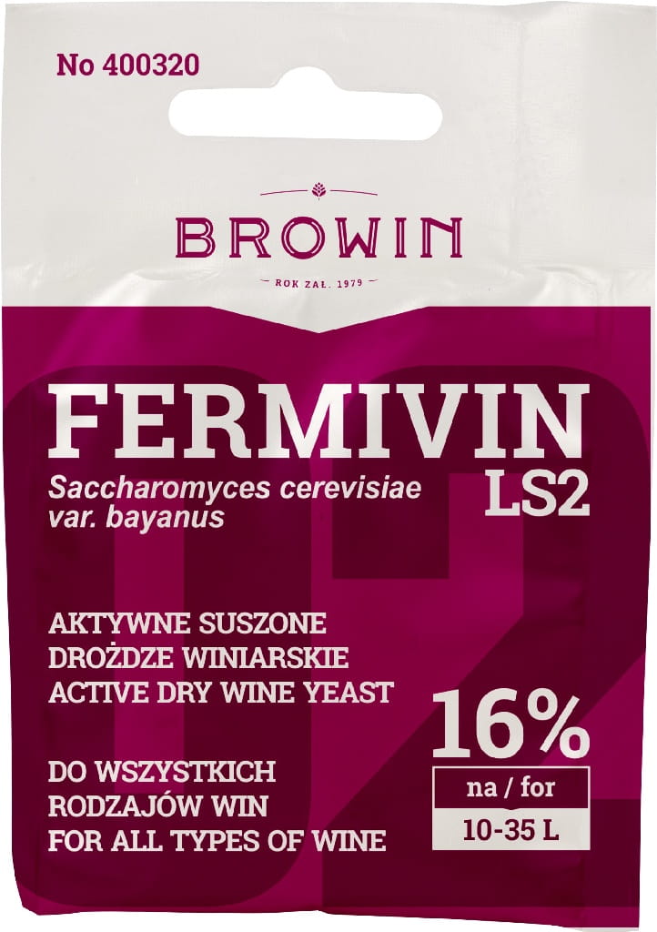 Komórki wysoce aktywnych drożdży, suszone są fluidalnie il.7g. Pojedyncza dawka wystarcza na przygotowanie do 35 l wina. Fermivin LS2 Saccharomyces cerevisiae (bayanus) - do win białych, czerwonych oraz różowych. Doskonałe do win musujących. Charakteryzują się pełnym odfermentowaniem i szybkim klarowaniem. Zachowują aromat owoców. Odporne na zakażenia. Tolerancja na alkohol do ok.16 %.
