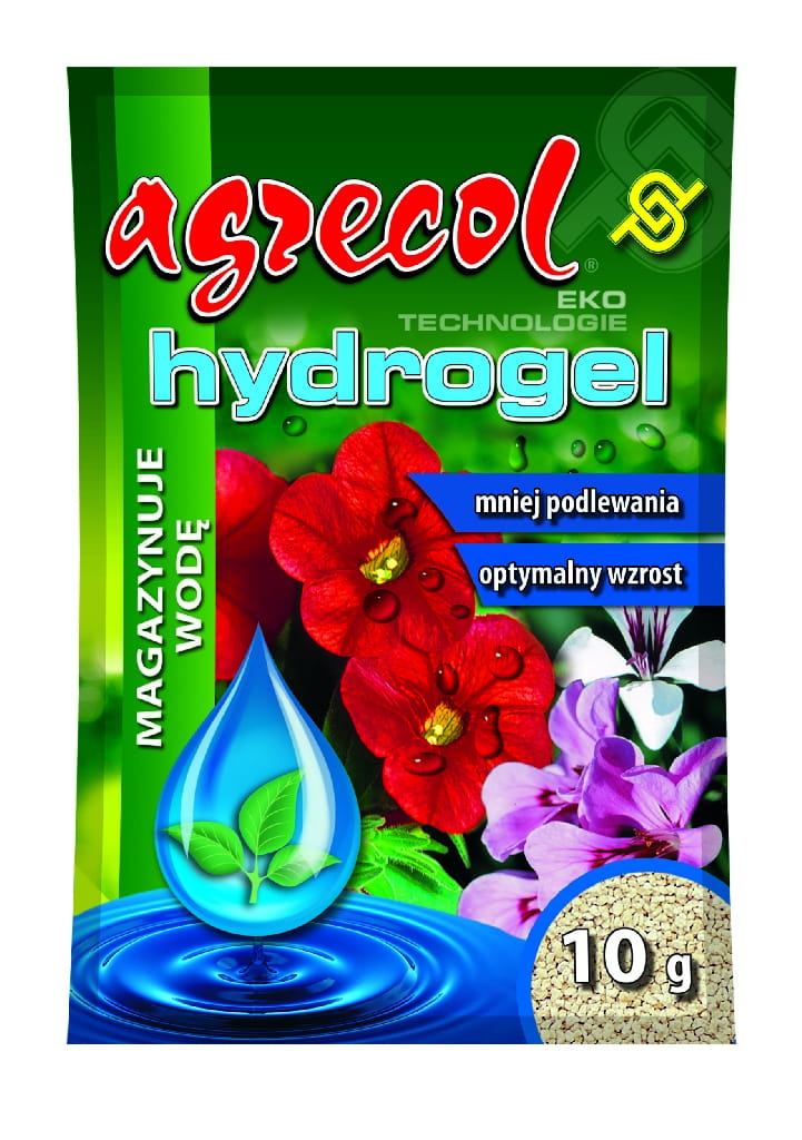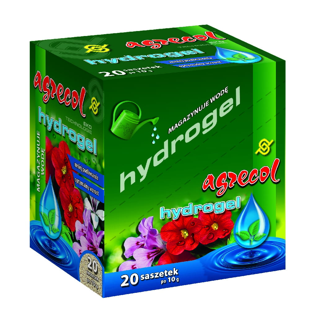 Hydrogel to produkt w postaci mikrokryształków przeznaczony do magazynowania wody w glebie. Mikrokryształki wchłaniają wodę i składniki pokarmowe, tworząc miękki hydrożel. W okresie suszy rośliny pobierają wodę zawartą w hydrogel’u. Preparat przyczynia się do lepszego wykorzystania składników pokarmowych. Stosowanie Hydrogel’u przyspiesza kiełkowanie nasion i wzrost młodych roślin. Wpływa pozytywnie na ukorzenianie się sadzonek i tworzenie rozbudowanego systemu korzeniowego. Korzystnie oddziałuje na wzrost części nadziemnej oraz poprawia kondycję roślin. Proces pobierania i oddawania wody przez mikrokryształki może następować wielokrotnie w ciągu całego okresu wegetacji, co ogranicza straty wody z podłoża.