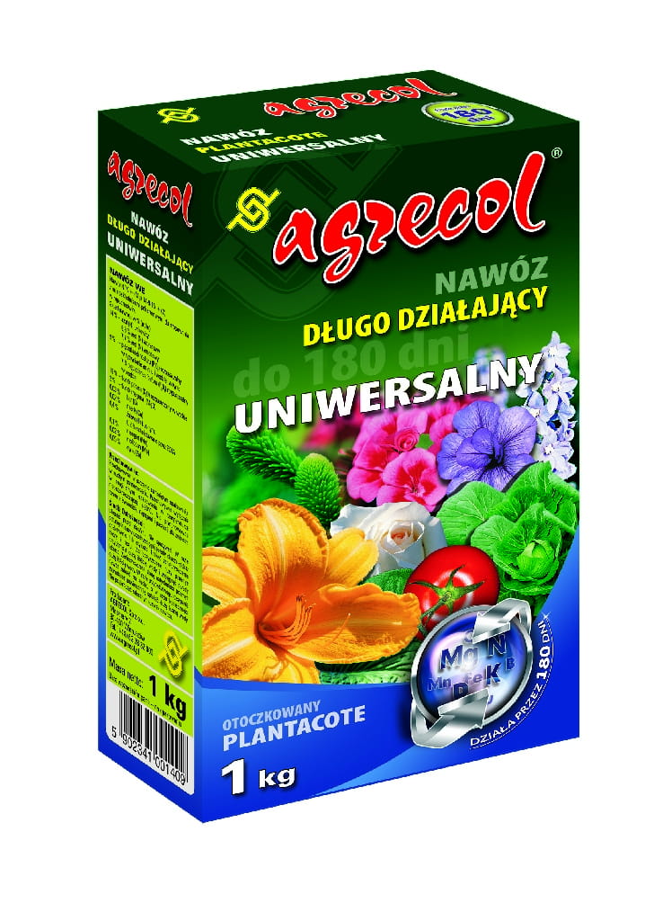 Plantacote nawóz uniwersalny to nowoczesny, kompletny nawóz przeznaczony do nawożenia w uprawach roślin ozdobnych, warzywniczych, sadowniczych oraz roślin domowych i balkonowych. Otoczkowane granule zapobiegają wypłukiwaniu nawozu do głębszych warstw podłoża, niedostępnych dla korzeni roślin. W ten sposób więcej składników odżywczych jest wykorzystywanych przez rośliny (aż do 80-90%). Stosowanie nawozu otoczkowanego niweluje ryzyko przenawożenia, a przy tym chroni środowisko naturalne. Plantacote to kompletny, wieloskładnikowy nawóz o działaniu determinowanym przez czynniki środowiska, tj. wilgotność i temperaturę otoczenia. To najdłużej uwalniający składniki pokarmowe nawóz w ofercie Agrecol. Dzięki zastosowaniu specjalnej technologii otoczkowania zabieg nawożenia można wykonywać jedynie raz w sezonie wegetacyjnym.