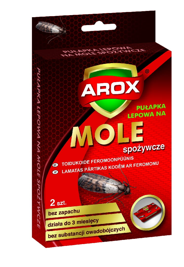 Pułapka lepowa na mole spożywcze w postaci tekturowego trójkąta pokrytego wewnątrz substancją klejącą. Przeznaczona do wyłapywania moli spożywczych z pomieszczeń kuchennych, spiżarni oraz wszelkich innych pomieszczeń, w których przechowywane są artykuły spożywcze. Produkt nie zawiera substancji owadobójczych co sprawia, że może być stosowany bezpośrednio w miejscach przechowywania artykułów, takich jak: kasze, płatki, mąka, makarony, kakao, czekolada, kawa zbożowa, suszone owoce itp. Produkt w naturalny sposób wabi owady, które przyklejają się do powierzchni pokrytej substancją klejącą.