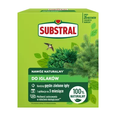 SUBSTRAL® Nawóz naturalny do Iglaków to w 100% naturalny nawóz wzbogacony organicznym minerałem zeolitem, który w połączeniu z nawozem zatrzymuje składniki pokarmowe w glebie, zapewniając lepsze wchłanianie nawozu. Dodatkowo dzięki długo działającej formule roślina jest odżywiana aż przez 3 miesiące, dzięki czemu uzyskuje bardziej obfite plony. Formuła złożona ze składników pochodzenia roślinnego, wzbogacona naturalnymi minerałami*. Nie zawiera substancji pochodzenia zwierzęcego, dzięki czemu nie posiada nieprzyjemnego zapachu.
