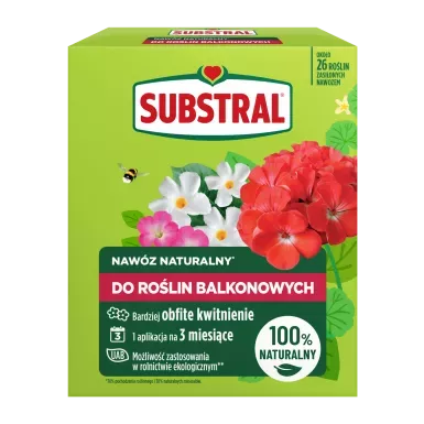 SUBSTRAL® Nawóz naturalny do Roślin balkonowych to w 100% naturalny nawóz wzbogacony organicznym minerałem zeolitem, który w połączeniu z nawozem zatrzymuje składniki pokarmowe w glebie, zapewniając lepsze wchłanianie nawozu. Dodatkowo dzięki długo działającej formule roślina jest odżywiana aż przez 3 miesiące, dzięki czemu uzyskuje bardziej obfite plony. Formuła złożona ze składników pochodzenia roślinnego, wzbogacona naturalnymi minerałami*. Nie zawiera substancji pochodzenia zwierzęcego, dzięki czemu nie posiada nieprzyjemnego zapachu.