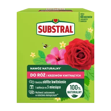 SUBSTRAL® Nawóz naturalny do Róż to w 100% naturalny nawóz wzbogacony organicznym minerałem zeolitem, który w połączeniu z nawozem zatrzymuje składniki pokarmowe w glebie, zapewniając lepsze wchłanianie nawozu. Dodatkowo dzięki długo działającej formule roślina jest odżywiana aż przez 3 miesiące, dzięki czemu uzyskuje bardziej obfite plony. Formuła złożona ze składników pochodzenia roślinnego, wzbogacona naturalnymi minerałami*. Nie zawiera substancji pochodzenia zwierzęcego, dzięki czemu nie posiada nieprzyjemnego zapachu.