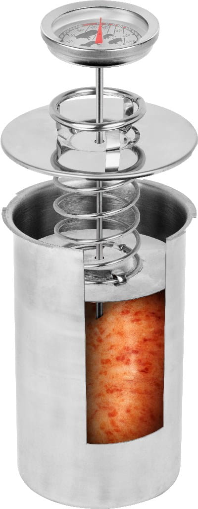 Na środku wieczka znajduje się gniazdo z otworem umożliwiającym bezpośredni pomiar temperatury wsadu mięsnego. Służy do tego termometr z sondą, który nie jest elementem zestawu.