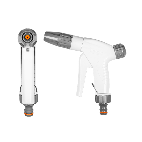 Pistolet do zraszania 2x regulowany "PROSTY" Podwójnie regulowany dopływ i wypływ wody. Wykonany z najwyższej jakości tworzywa ABS. Testowany powietrzem na urządzeniach ciśnieniowych. 2 lata gwarancji. Dostępny w kolorze szaro-białym. Każdy produkt z grupy WHITE LINE posiada przywieszkę z kodem kreskowym i opisem.