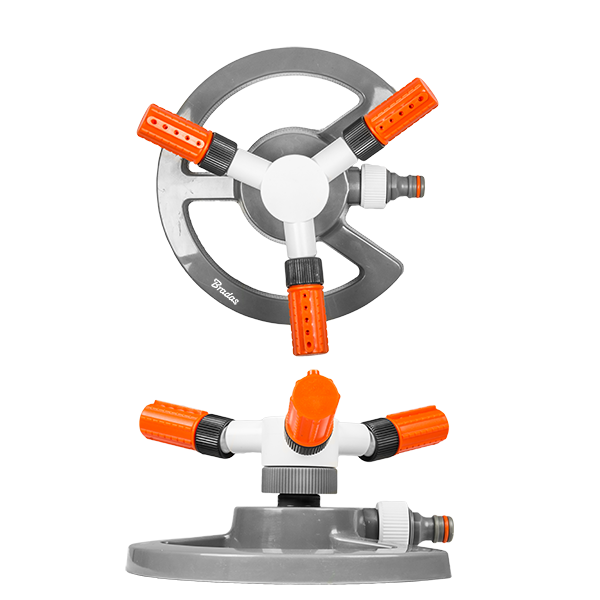 3-ramienny zraszacz obrotowy - regulowany kąt ustawienia ramion umożliwia dostosowanie zasięgu zraszania- rotacyjny ruch ramion zapewnia równomierne zraszanie- średnica nawadniania: 10,4 m, zasięg: 85 m2- 8'' podstawa z tworzywa sztucznego